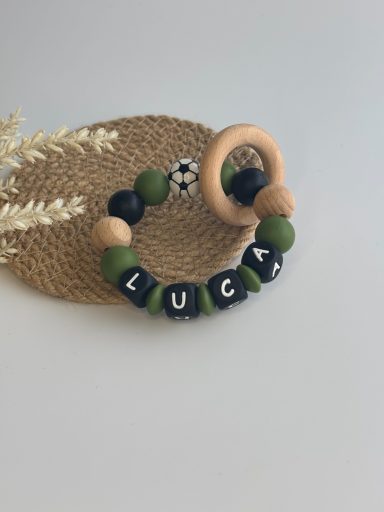 Deze handgemaakte bijtring in stoere tinten staal, blauw en zwart is niet alleen een eyecatcher, maar ook een uitkomst voor je kleintje bij doorkomende tandjes. Gemaakt van veilige, BPA-vrije siliconen en onbehandeld beukenhout, biedt hij verlichting voor gevoelig tandvlees én stimuleert hij de grijpreflex. Personaliseer de bijtring met de naam van je kindje voor een uniek en functioneel cadeau – perfect voor een kraamfeest of babyshower!